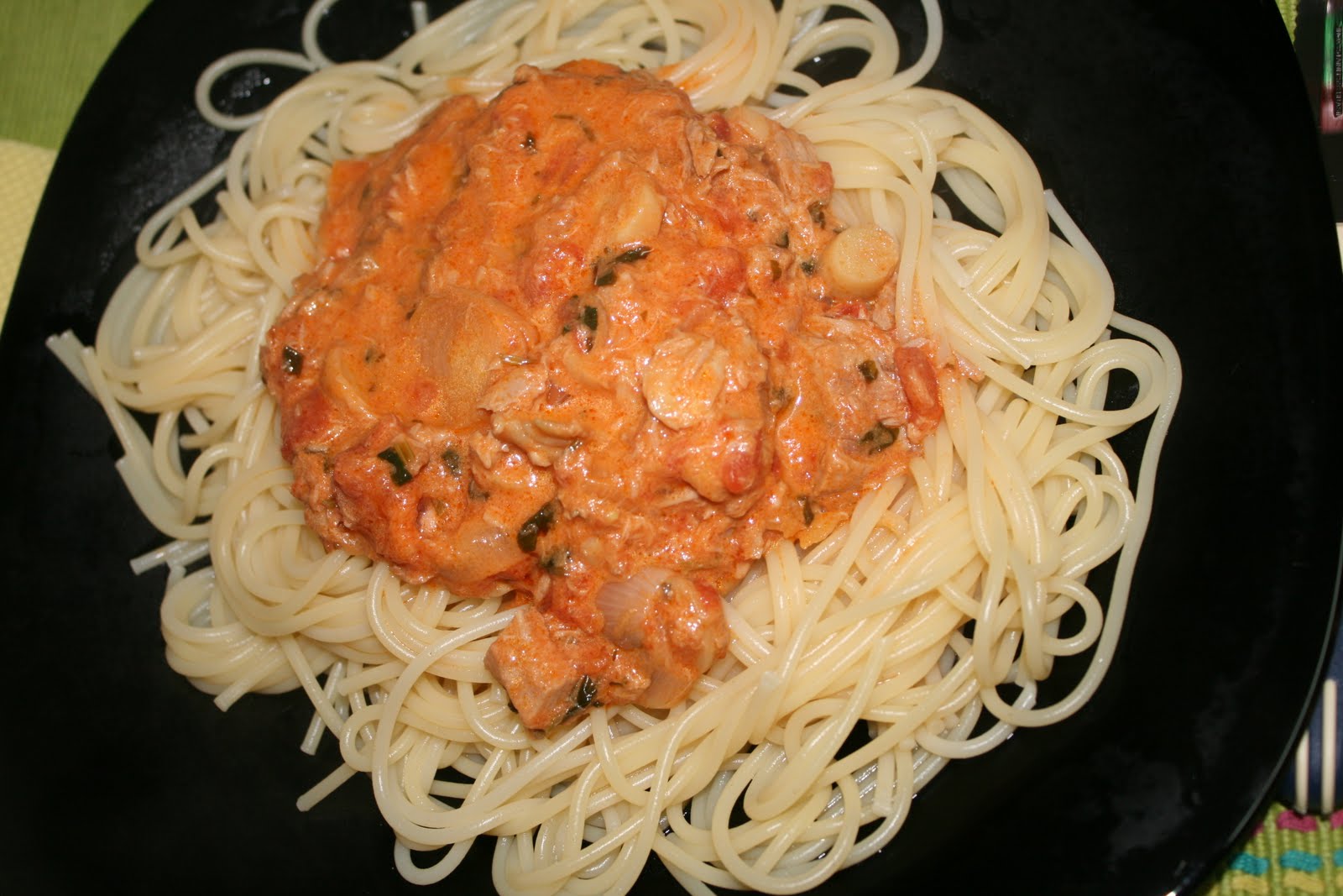 Refogue a cebola em azeite, adicione o tomate e deixe cozinhar. Abra as latas de atum e desfaça-o com um garfo. Junte as natas e os cogumelos ao refogado e deixe cozinhar mais 5 minutos. Tempere com sal, polvilhe com coentros e acrescente o atum. Coza o esparguete e disponha num prato, por cima coloque a bolonhesa de atum. Se gostar de queijo parmesão, polvilhe por cima que dá um óptimo sabor.