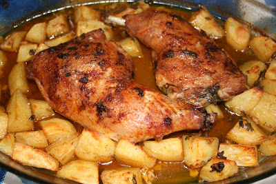 Num tabuleiro de ir ao forno coloque as pernas de frango e as batatas a volta, cortadas em cubos. Numa tigela junte com todos os restantes ingredientes, misture e barre o preparado anterior. Por fim leve o tabuleiro ao forno a 140º durante 20 minutos para a carne ficar bastante saborosa, aumente a tempere forno para os 180º por mais 25 minutos.